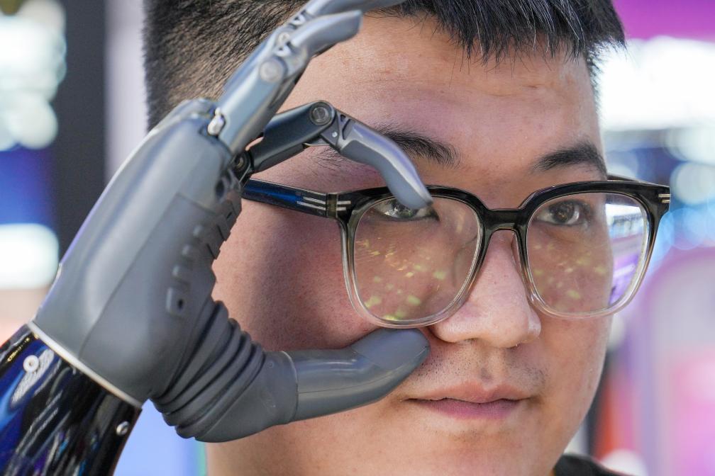 “列国将勤奋鞭策人工智能向愈加、包涵、普惠、公允、向善的标的目的成长。浙江强脑科技无限公司一名左手残疾的工做人员正在佩带了BrainCo智能仿外行后摘取眼镜。