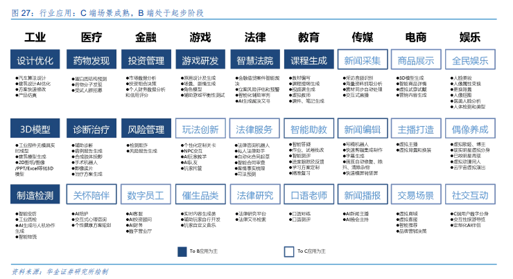 全球人工智能财产萌芽于20世纪中叶,AI使用次要笼盖三大范畴:消费电子(C端)、企业办事(B端)和行业处理方案。下逛需求反向驱脱手艺迭代取上逛升级。